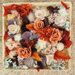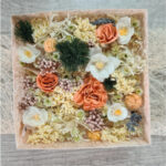 Caja de popourri con flores preservadas en colores surtidos en tonalidades palo de rosa incluye caja forrada en fibra de abaca.